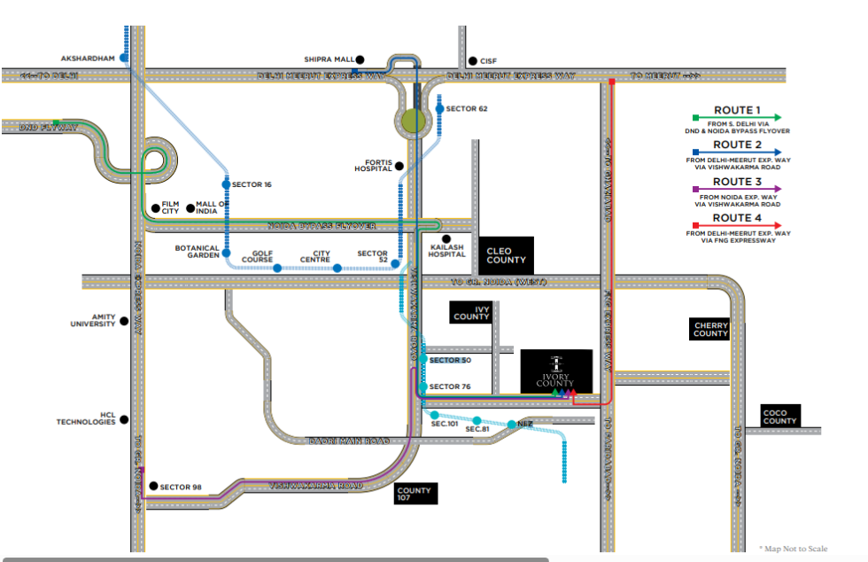 The project’s lush green landscape in Sector 115, Noida, is a visual delight, inviting you to experience tranquility even with a mere squint. Boasting a strategic location, Ivory County provides proximity to key areas in Noida and Delhi-NCR, including the FNG and Noida-Greater Noida Expressway. This prime locale enhances daily convenience and promises a wise investment for the future.