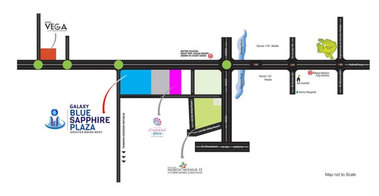 Galaxy Blue Sapphire Plaza is a three side open plot, facing the 130 metre, 45 metre and 24 metre road respectively. It is surrounded by a residential society of up to 25,000 flats, all that are walking distance. Furthermore, to attract clientele of all ages, the Blue Sapphire Plaza offers a 12 screen multiplex, food court, doctor’s chambers, high street retail shopping and large anchors on different floors. To top it all off, it is one of the largest commercial projects within the commercial belt of Noida Extension, encompassing an area off almost 25,661 square meters.